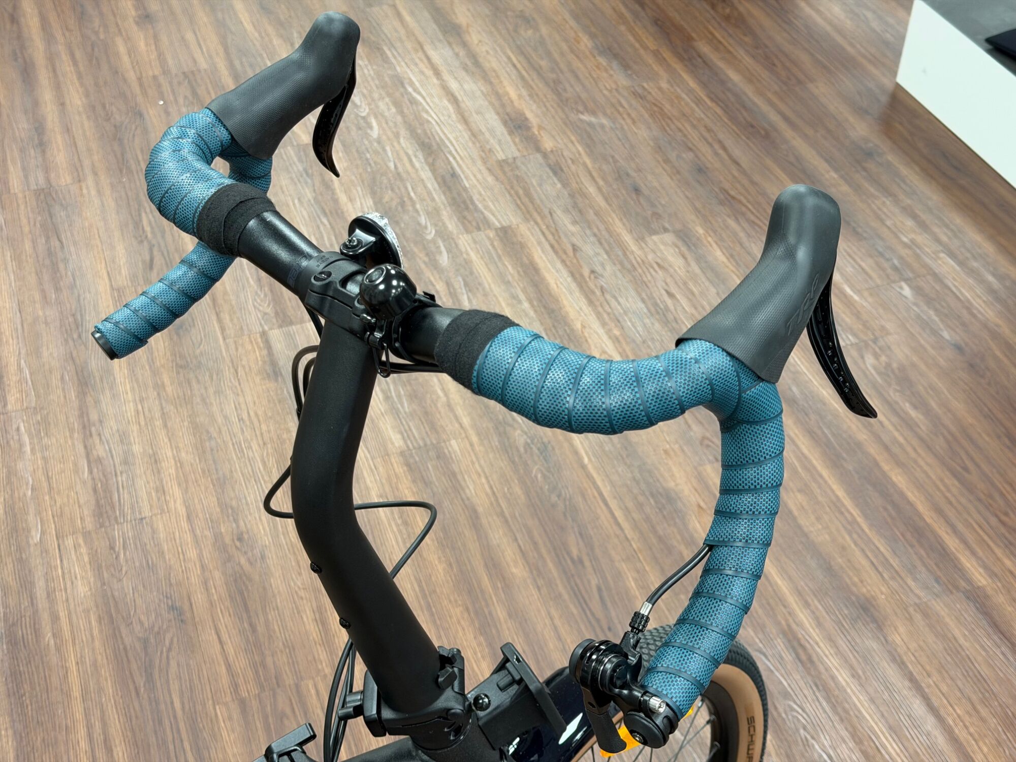 Wir haben einen Drop Downlenker mit Spezialbremsgriffen und Schaltung montiert. Dazu das Brooks Cambium Lenkerband und Cambium Sattel in Octaneblau.